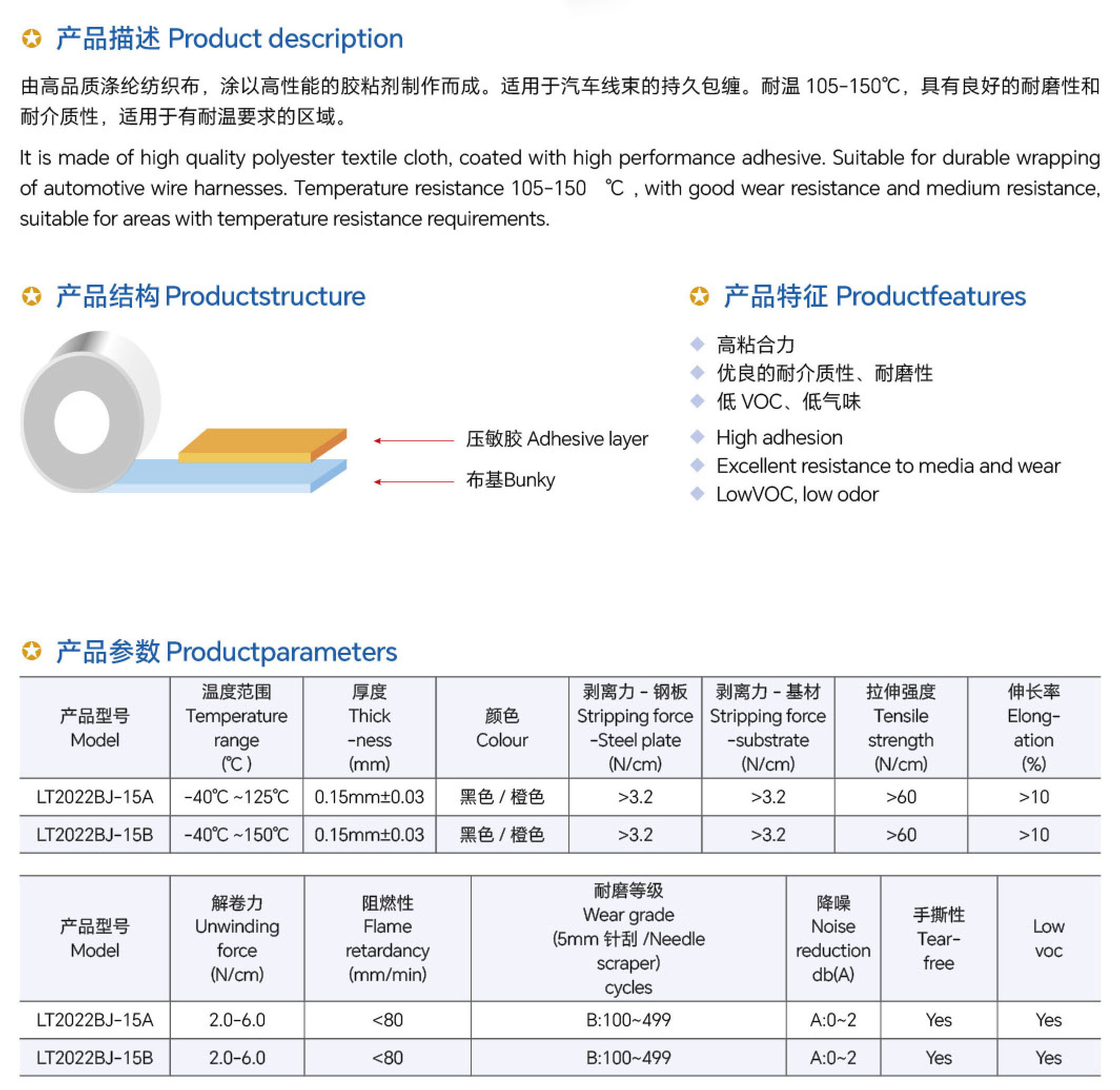 由高品質滌綸紡織布,涂以高性能的膠粘劑制作而成。適用于汽車線束的持久包纏。耐溫105-150℃,具有良好的耐磨性和耐介質性,適用于有耐溫要求的區域。