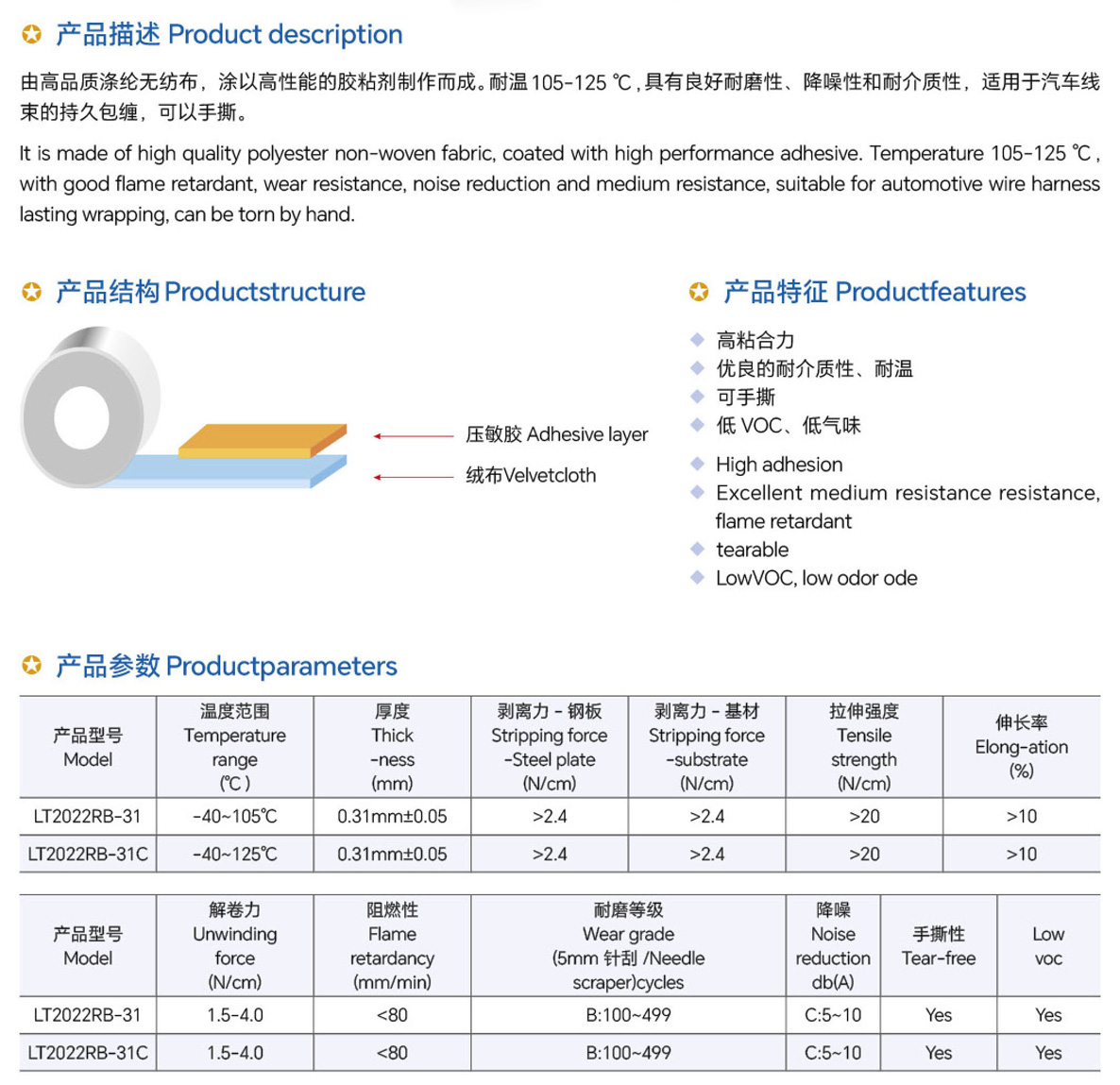 由高品質(zhì)滌綸無(wú)紡布,涂以高性能的膠粘劑制作而成。耐溫105-125℃,具有良好耐磨性、降噪性和耐介質(zhì)性,適用于汽車線束的持久包纏,可以手撕。